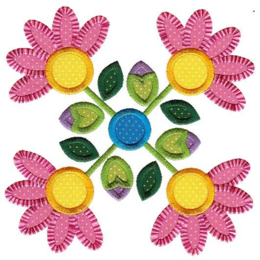 | Requirements: | Embroidery machine with 5X7 hoop Scissors Tear away stabilizer 8X8 pieces of fabric in the following colors: Pink, purple, yellow, light green, dark green, light blue Embroidery thread in same colors as fabric |