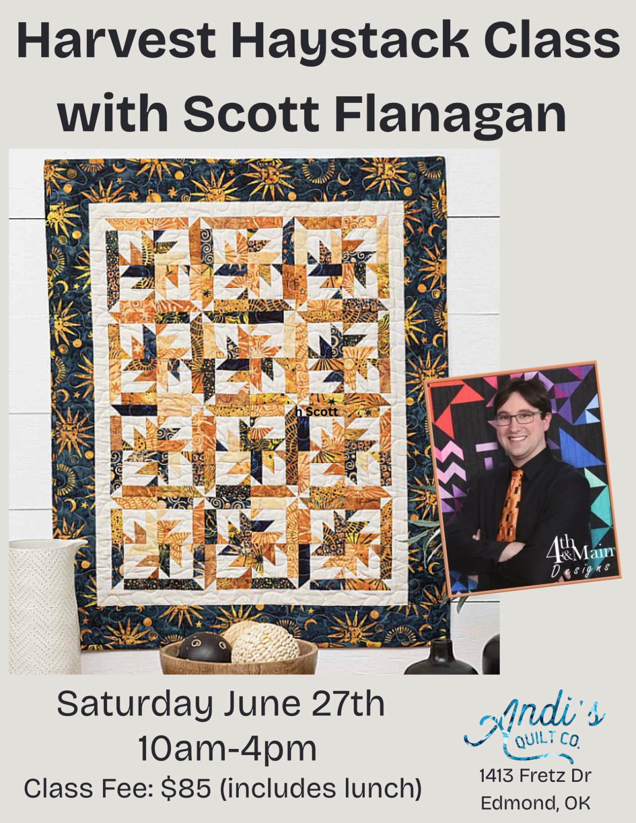 Join nationally known quilter, speaker, and pattern writer, SCOTT FLANAGAN, as he guides you through making the Harvest Haystack quilt! We are so excited to have Scott in our store to teach his pattern!